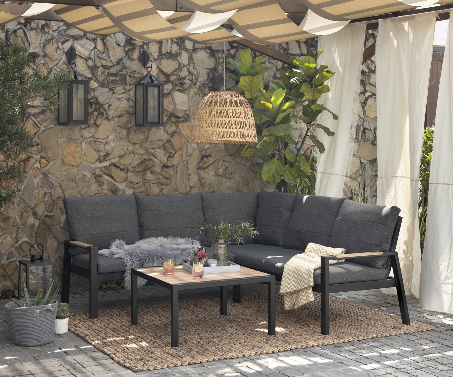 Oleskeluryhmä, jossa 1 kulmasohva ja 1 sohvapöytä. Valmistettu ruostumattomasta alumiinista olefiinityynyillä.