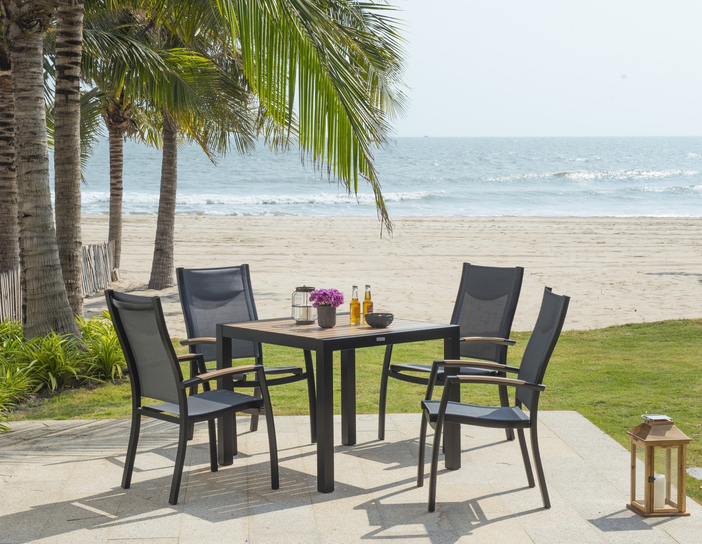 Ruokailuryhmä, jossa 1 90 cm ruokapöytä ja 4 pinottavaa ruokatuolia. Valmistettu ruostumattomasta alumiinista. Verkkokankaalla päällystetyt tuolit. Huoltovapaa.