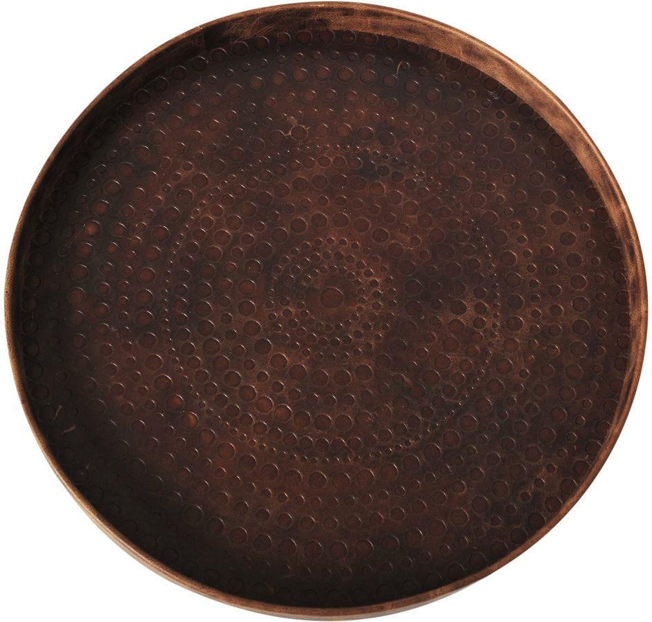 Pyöreä nahkapäällysteinen tarjoilualusta.