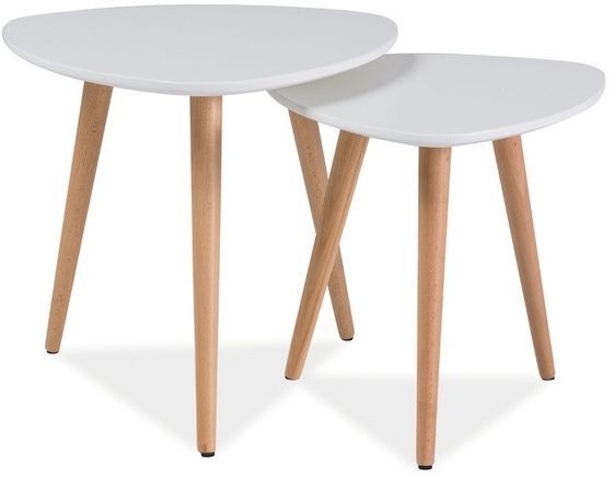 Pari upeaa ja tyylikkäästi muotoiltua pinottavaa pöytää. Runko on valmistettu pyökinvärisestä puusta ja pöytälevy valkoiseksi maalatusta MDF:stä.