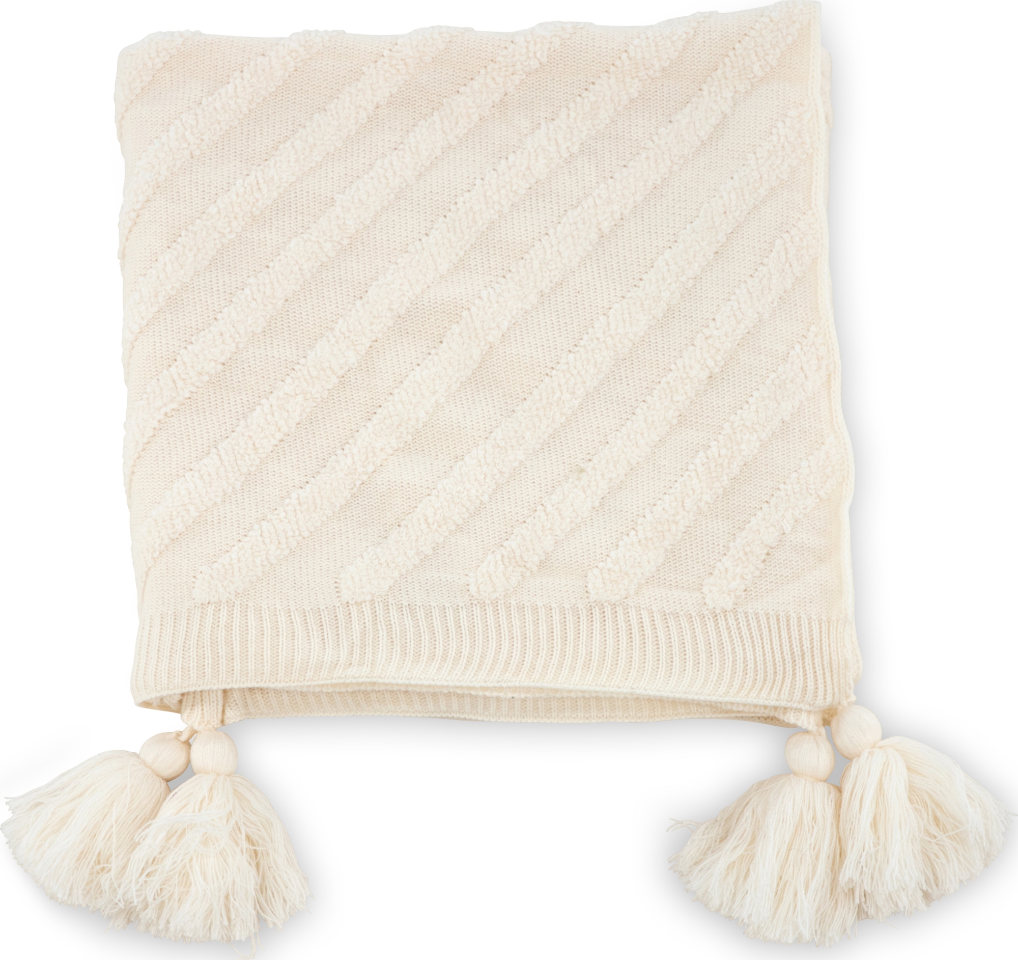 Plaid akryylikankaasta koristeellisilla tupsuilla.