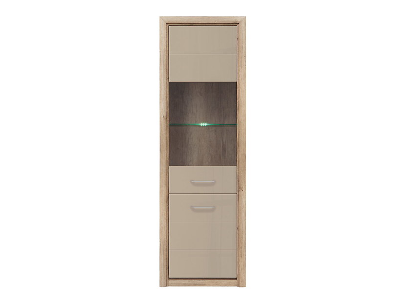 Kaunis ekimitaion-vitriinikaappi beigeillä etupuolella. Kaappi on toimiva, sillä siinä on mahdollista sekä näyttää että piilottaa esineitäsi, koska vain osa ovesta on lasia. Vitriinissä on useita hyllyjä, joiden ansiosta tavarasi on helppo pitää järjestyksessä.
