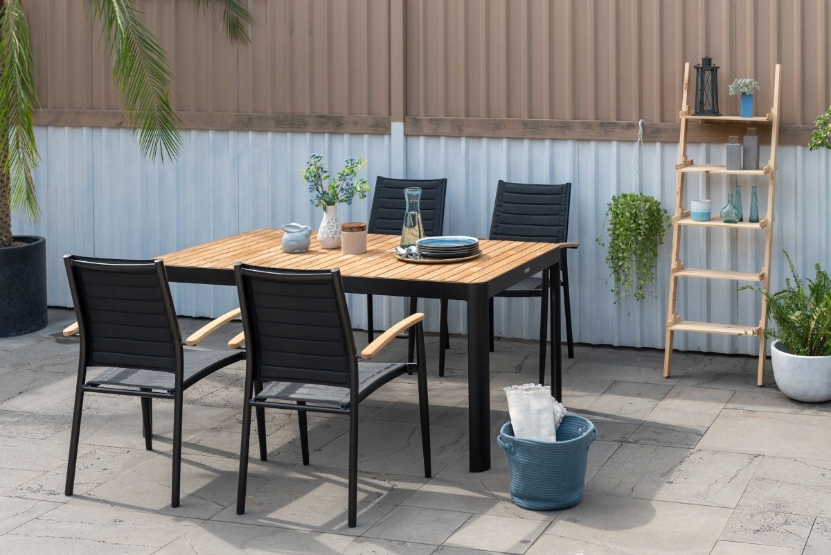 Ruokailuryhmä, jossa 1 ruokapöytä (161x95 cm) ja 4 pinottavaa ruokatuolia.