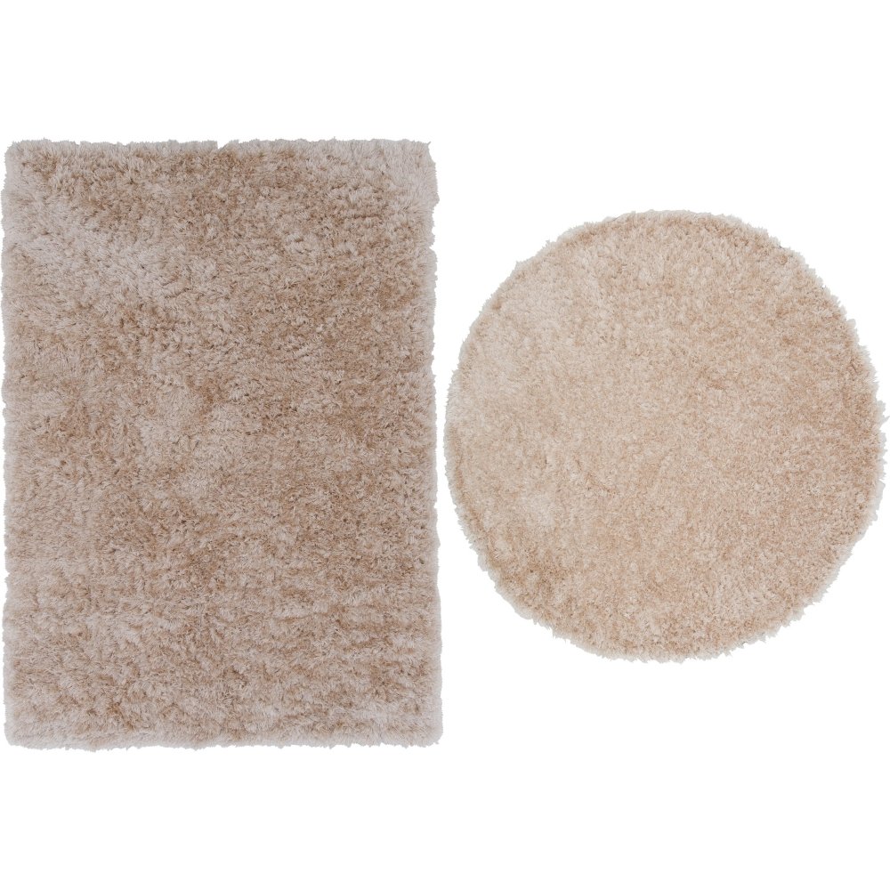 Pörröinen samppanjanvärinen polyesterimatto, jossa silkkisen tuntuinen. Yksinkertainen kudos, korkea ja tiivis nukka.