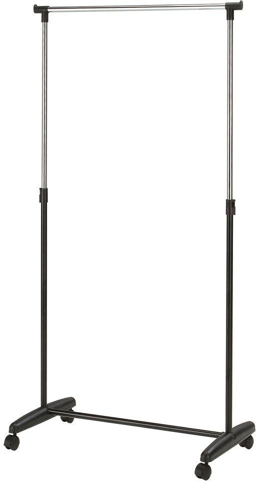 Käytännöllinen ja tyylikkäästi muotoiltu vaateteline, joka on valmistettu metallista ja muovista. Korkeutta voidaan säätää ja pyörät helpottavat kalusteen siirtämistä.