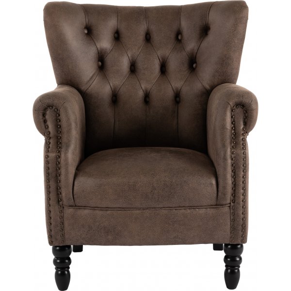 Ruskeasta polyesterikankaasta valmistettu nojatuoli, jossa mustat puiset jalat ja koristeniitit.