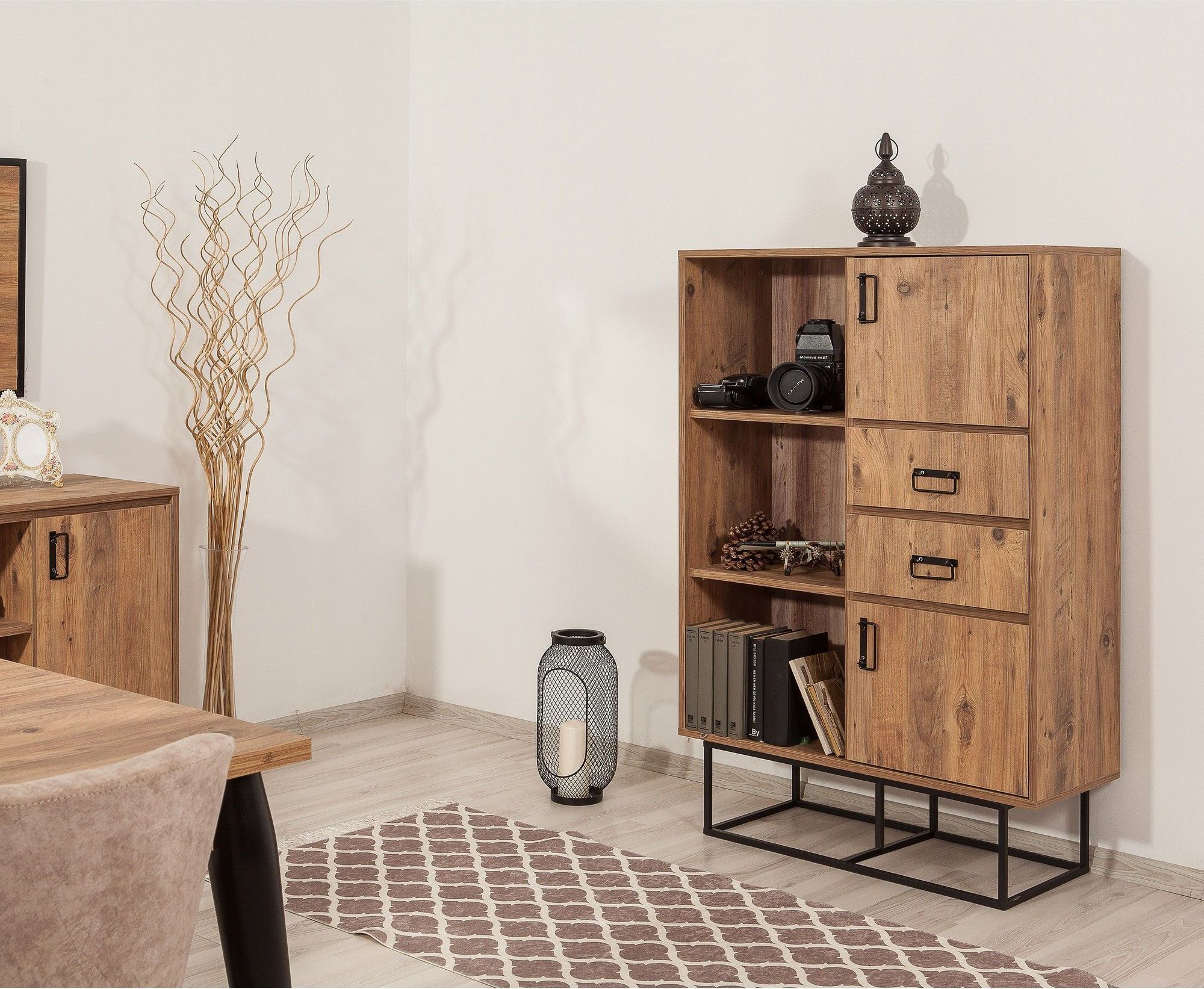 Puusta ja metallista valmistettu kirjahylly.