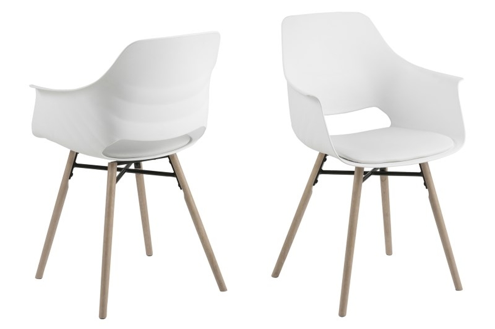 Mukava ruokatuoli, valmistettu valkoisesta muovista ja tyyny on päällystetty valkoisella keinonahalla (PU) ja jalat on valmistettu valkoisesta pigmentoidusta ja öljytystä kumipuusta.