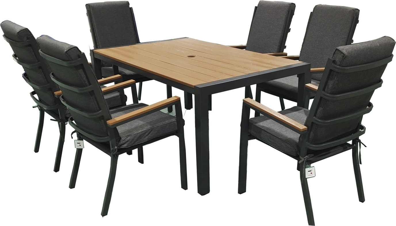 Ransby-ruokailuryhmä patiolle, pöytä ruskealla polywood-tasolla, tukeva alumiinirunko. Mukana on myös 6 runkotuolia vahvasta ja säänkestävästä alumiinirungosta harmailla istuintyynyillä.