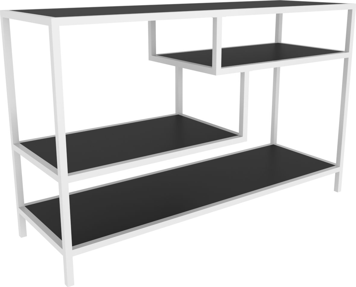 Metallinen mediapenkki, jossa melamiinipinnoitettu lastulevyhylly.
