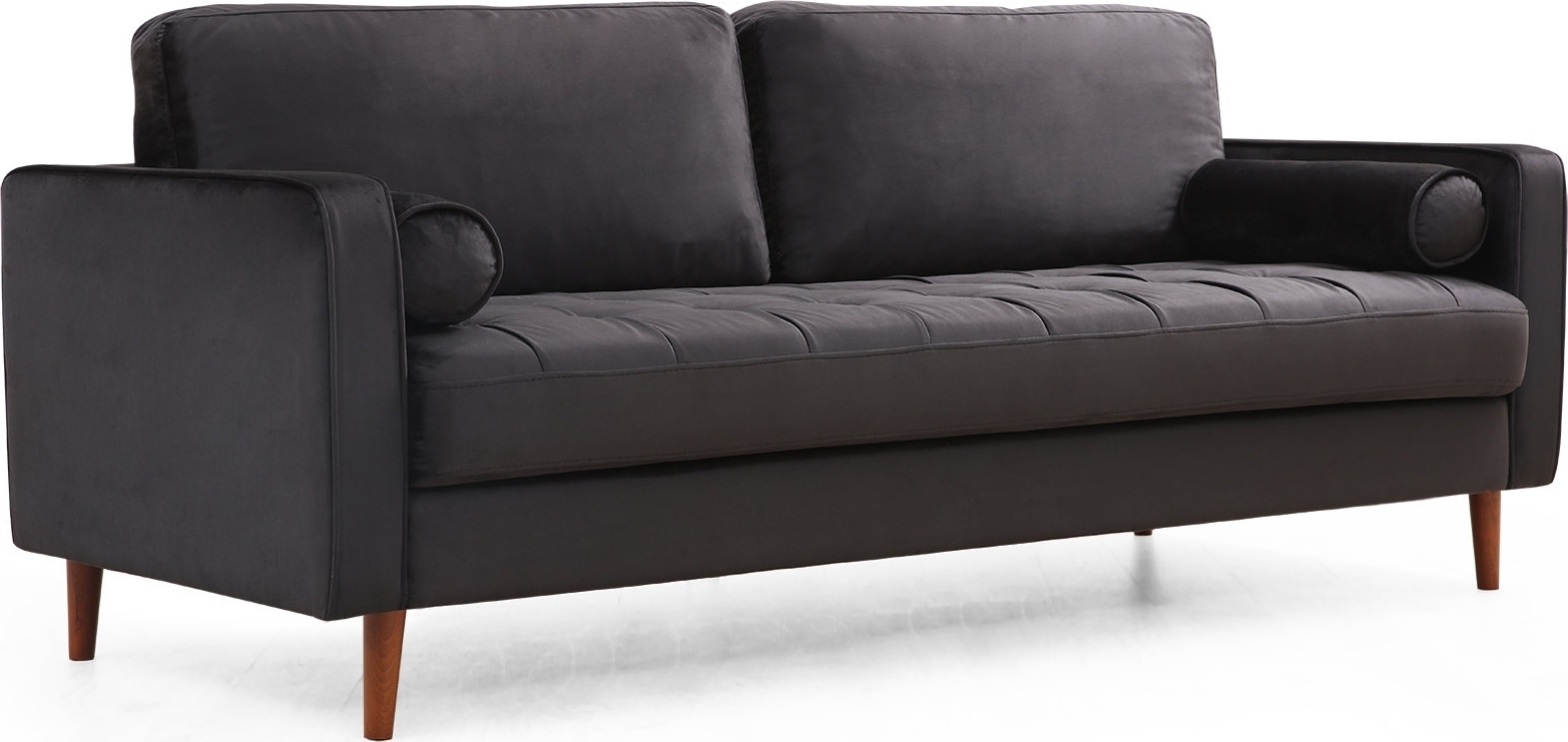 Puinen sohva polyesteriverhoilulla. Mukana 2 koristetyynyä.