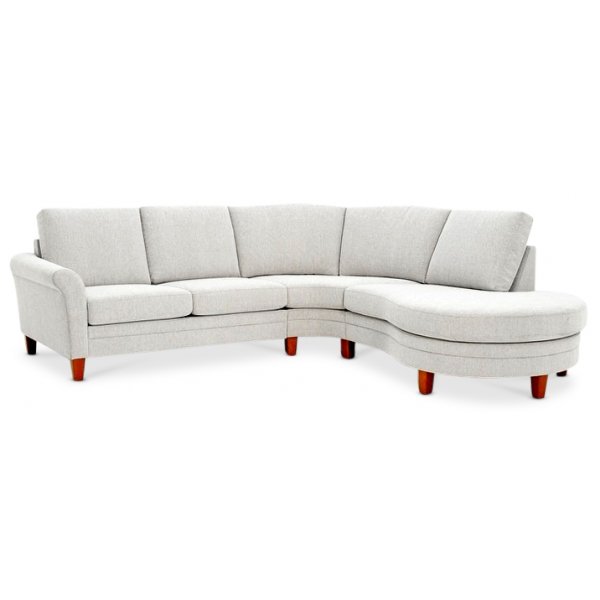 Kaarevan mallinen sohva pyöreällä ja isolla divaaniosalla. Selkätyynyt lepäävät ihanasti kallistuvaan runkoon, joka takaa hyvän istumamukavuuden. Huomioi upeat kaarevat käsinojat.