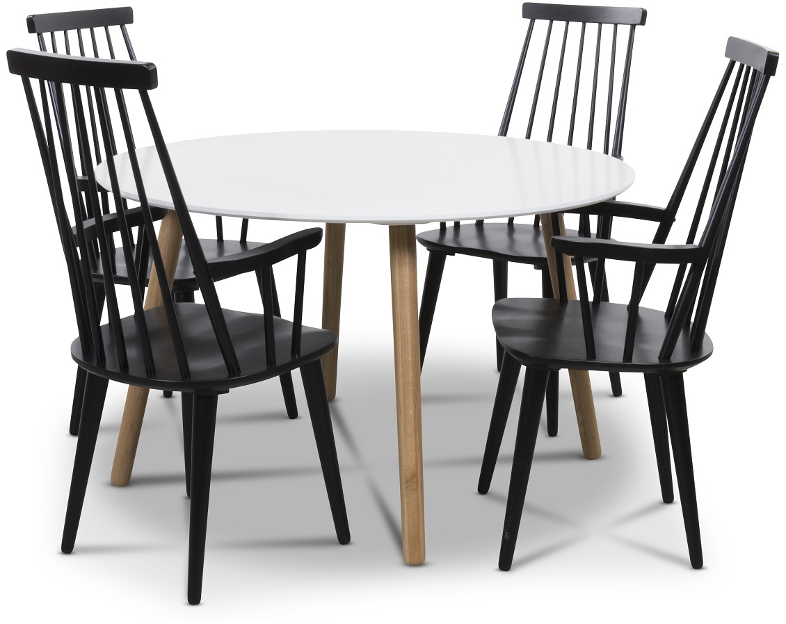 Ruokailuryhmä Skånska Möbelhusetilta, Classic pyöreä ruokapöytä Rosvik 120 cm halkaisijaltaan valkoinen lakattu kansi ja tammi ja neljä mustaa Dalsland uloketuolia käsinojilla, jotka luovat klassisen ja tyylikkään vaikutelman!