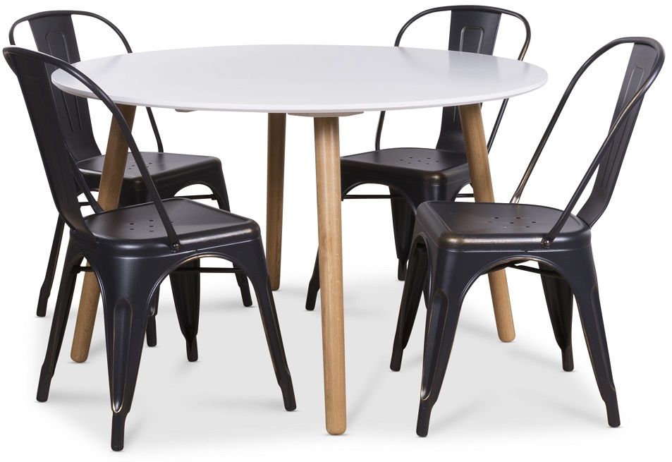 Rosvik-ruokailuryhmä, pyöreä ruokapöytä + 4 kpl Industry-peltituolia - Valkoinen/Musta/Kulta
