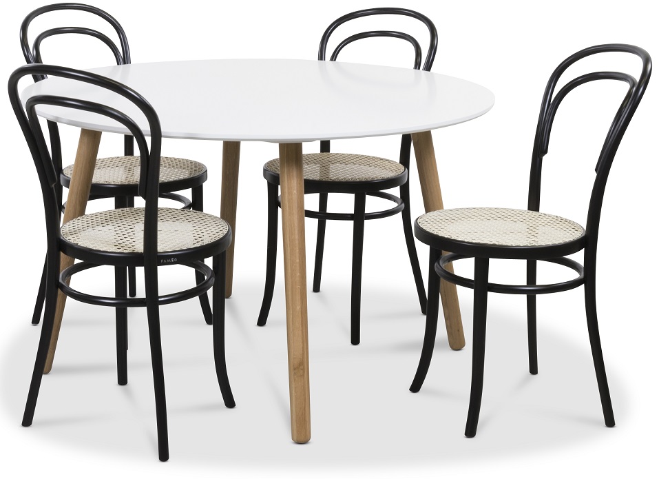 Rosvik-ruokaryhmä, pyöreä pöytä valkoinen/tammi + 4kpl mustaa Thonet No14 -tuolia