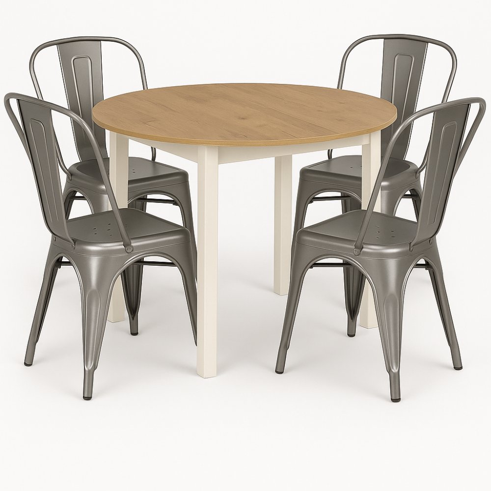 Elegantti ja monipuolinen ruokailuryhmä, joka yhdistää teollisen muotoilun ajattomaan toiminnallisuuteen. Tässä Berivan-ruokapöytä tammen ja valkoisena on yhdistetty neljään harjatusta teräksestä valmistettuun Industry-tuoliin - moderni puun ja metallin yhdistelmä, joka luo trendikkään mutta tasapainoisen kokonaisuuden.