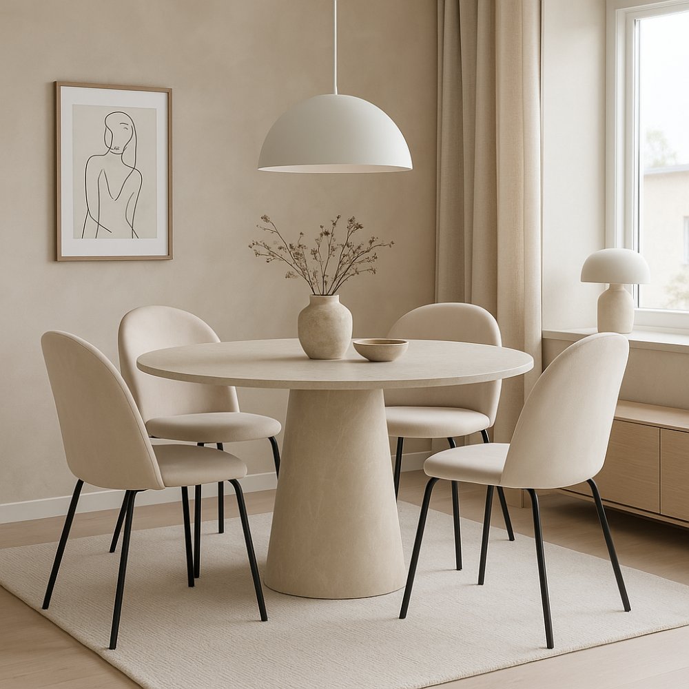 Beigensävyiset Astrid-tuolit täydentävät pöytää pehmeällä tekstuurillaan ja modernilla siluetillaan. Verhoiltu istuin ja selkänoja tarjoavat mukavan istumiskokemuksen, ja mustat jalat luovat tyylikkään kontrastin vaalealle kankaalle. Yhdessä ne muodostavat täydellisen ruokailuryhmän, joka sopii sekä klassisiin että moderneihin koteihin.