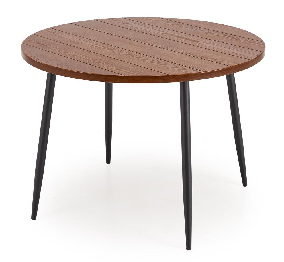 Ruokapöytä on pyöreä, halkaisijaltaan 105 cm ja korkeudeltaan 75 cm. Pöytälevyssä on lämmin, puunvärinen pinta, jossa on selkeä puurakenne ja pitkittäiset urat, jotka antavat luonnollisen ja tyylikkään vaikutelman.