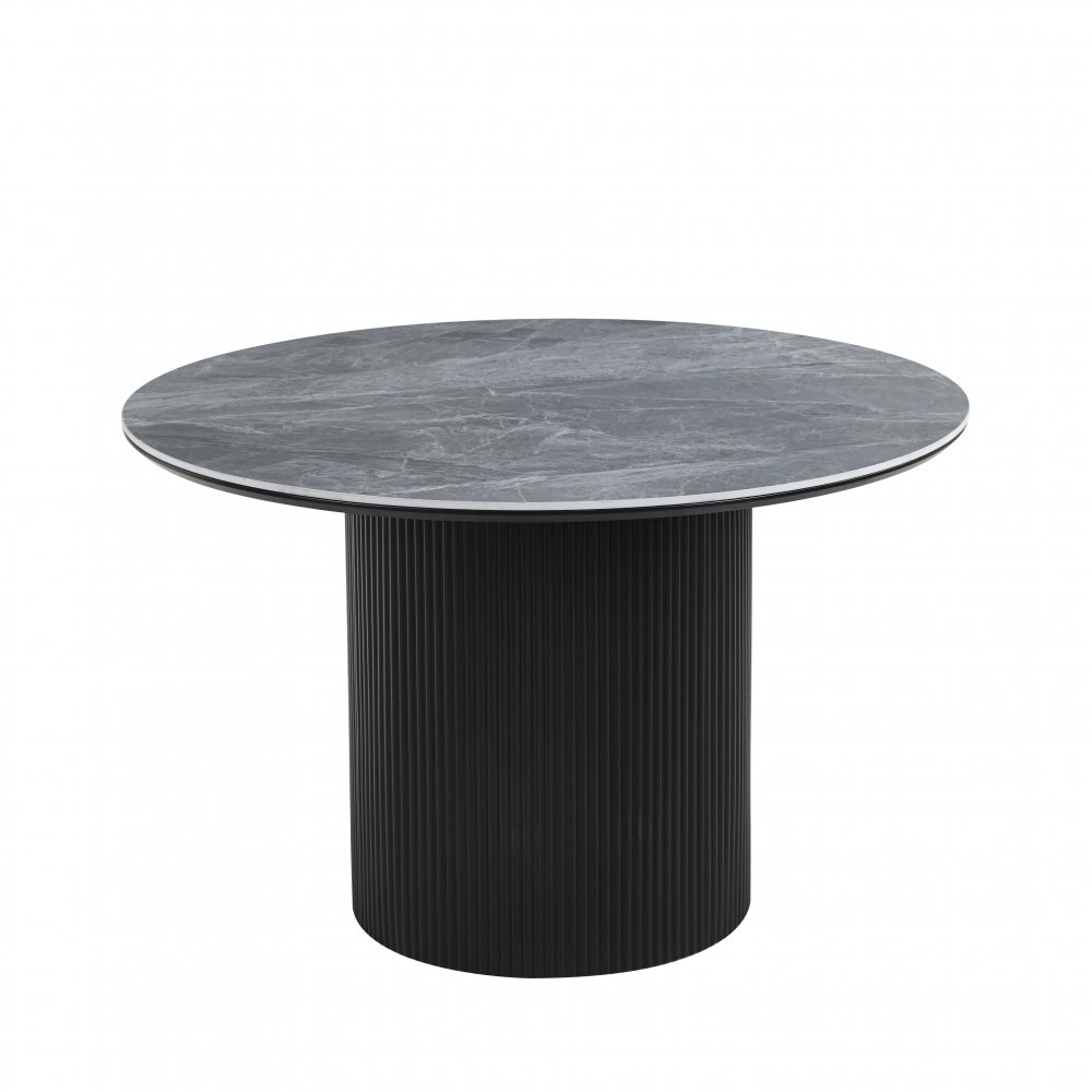 Salvador pyöreä ruokapöytä, jonka pöytälevy on harmaata, kestävää keraamista kiveä. Pohja mustaksi lakattua puuta. Moderni ja kestävä ruokapöytä. Ruokapöytä sopii 4-5 hengelle.