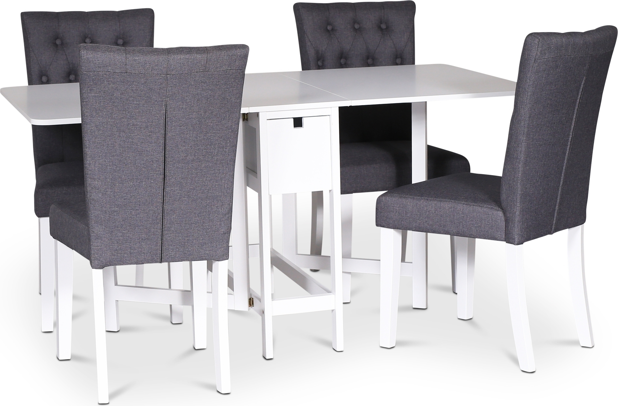 Sandhamn ruokailuryhmä Klassinen muotoilu. Tyylikäs kokoontaittuva pöytä 4 yhteensopivalla Crocket-tuolilla päällystetty harmaalla kankaalla.