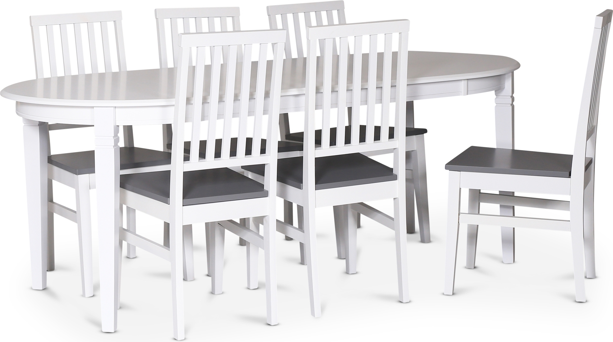 Sandhamn ruokailuryhmä Klassinen muotoilu. Tyylikäs soikea ruokapöytä, jossa valkoiseksi lakatut jalat ja pöytälevy.