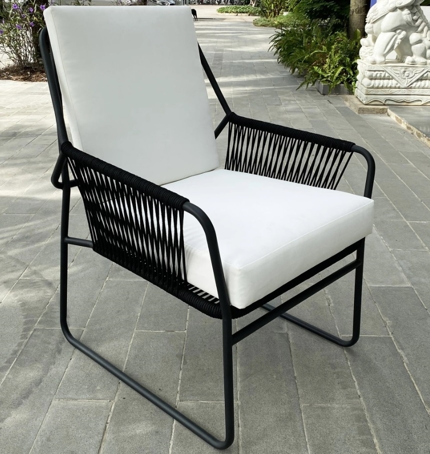 Sandhamnin hyvin suunnitellut tuotteet on tehty Ruotsin kesäilmastoon. Tuoli on valmistettu mattamustasta jauhemaalatusta galvanoidusta teräksestä. Mukana tyylikkäät valkoiset tyynyt. Musta laskuvarjoköysi sivuilla ja takana.