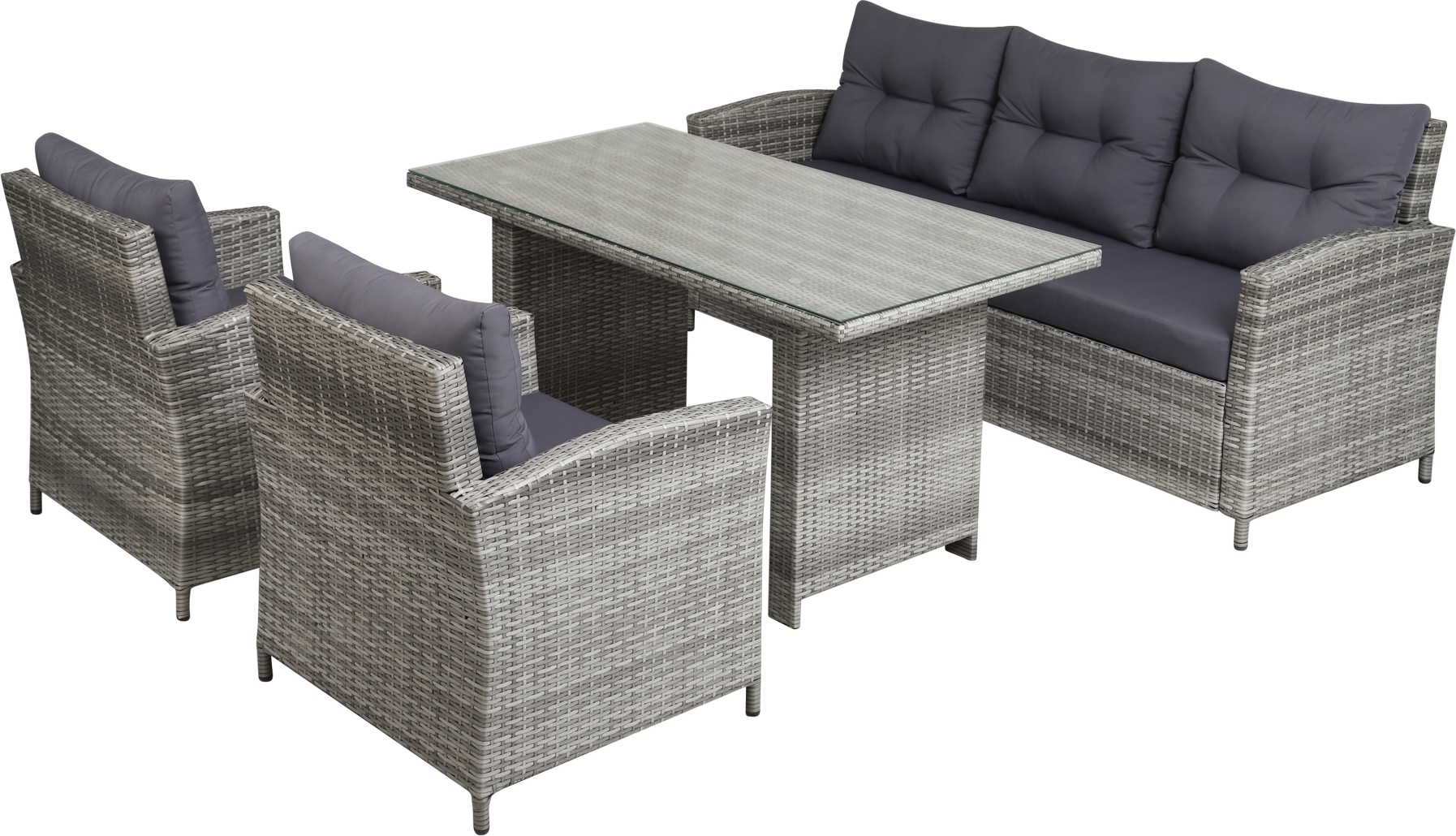 Santiago-ulkoiluryhmä harmaasta keinorottinkista ja siihen sopivat tummanharmaat polyesterityynyt. Säänkestävä metallirunko. Pöydän kansi on karkaistua lasia. Klassinen perheryhmä mukaviin kesäiltoihin.