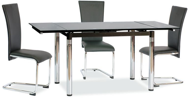 Hieno ruokapöytä modernilla designilla. Runko on valmistettu kromatusta metallista ja pöytälevy on valmistettu todella kestävästä mustasta karkaistusta lasista. Pöytä on käytännöllinen, sillä voit helposti pidentää sitä 110 senttimetristä 170 senttimetriin. Lisälevy sisältyy hintaan.