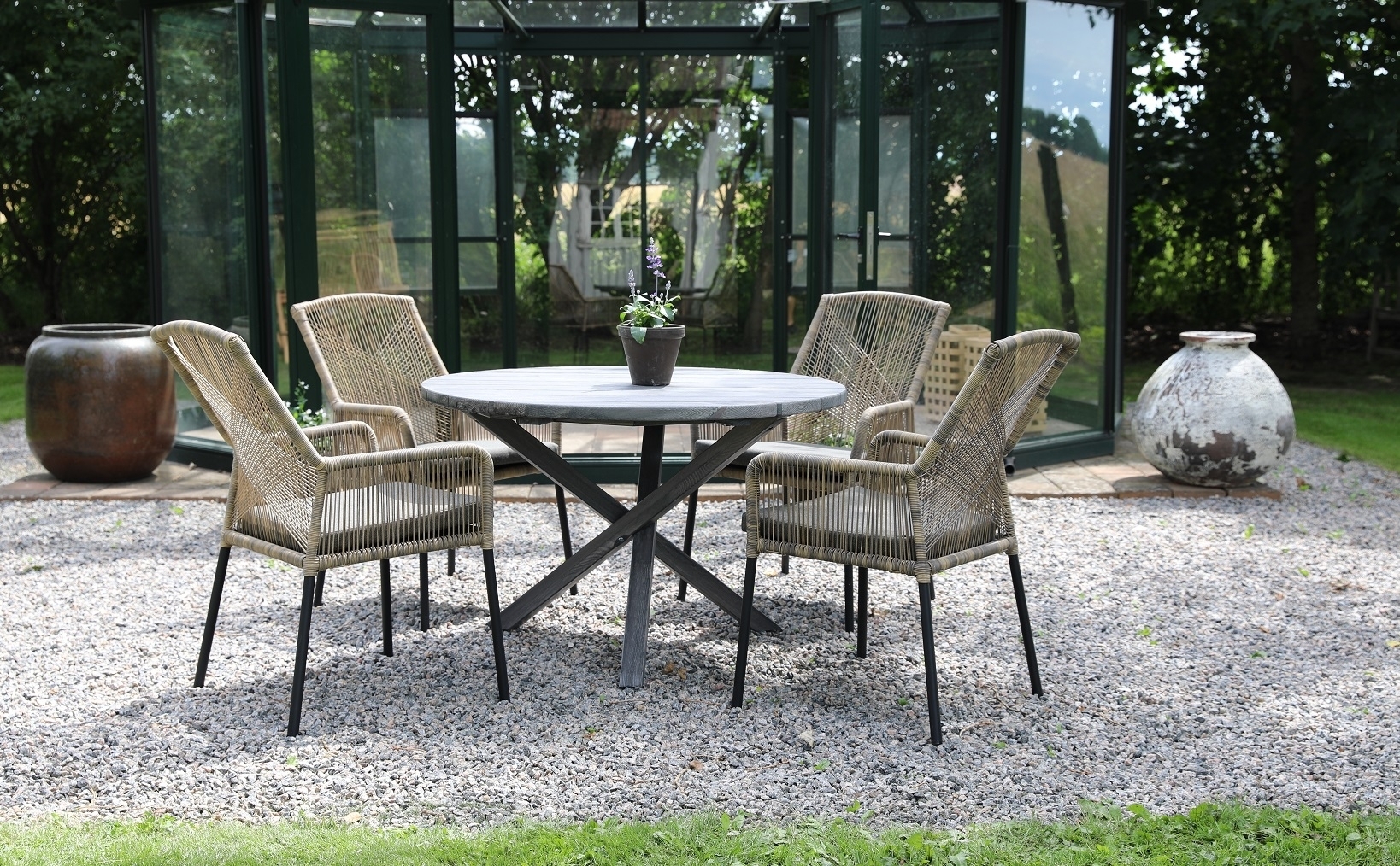 Scottsdale ulkoruokailuryhmä pöydän ympärillä 4 Ystad-runkoisella tuolilla - beige/harmaa