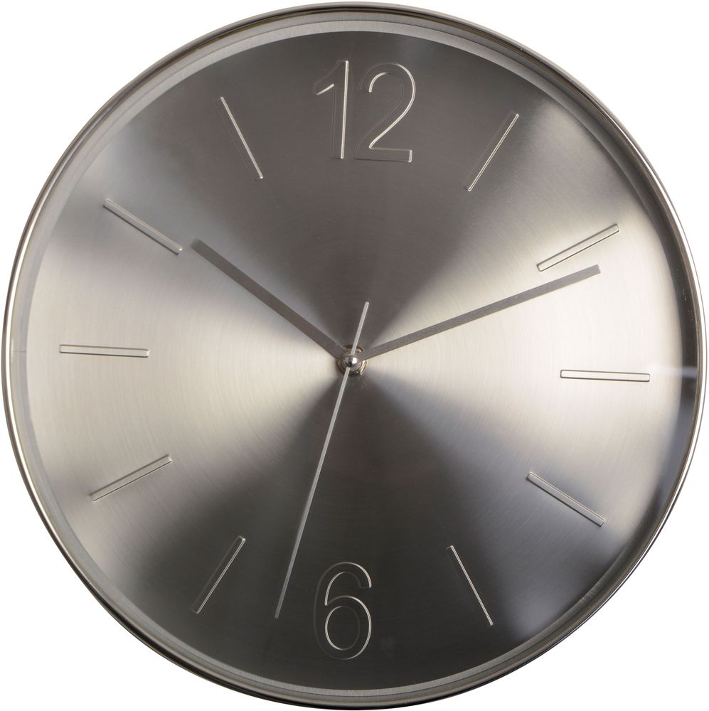 Hieno ja moderni seinäkello, valmistettu hopeanvärisestä muovista.