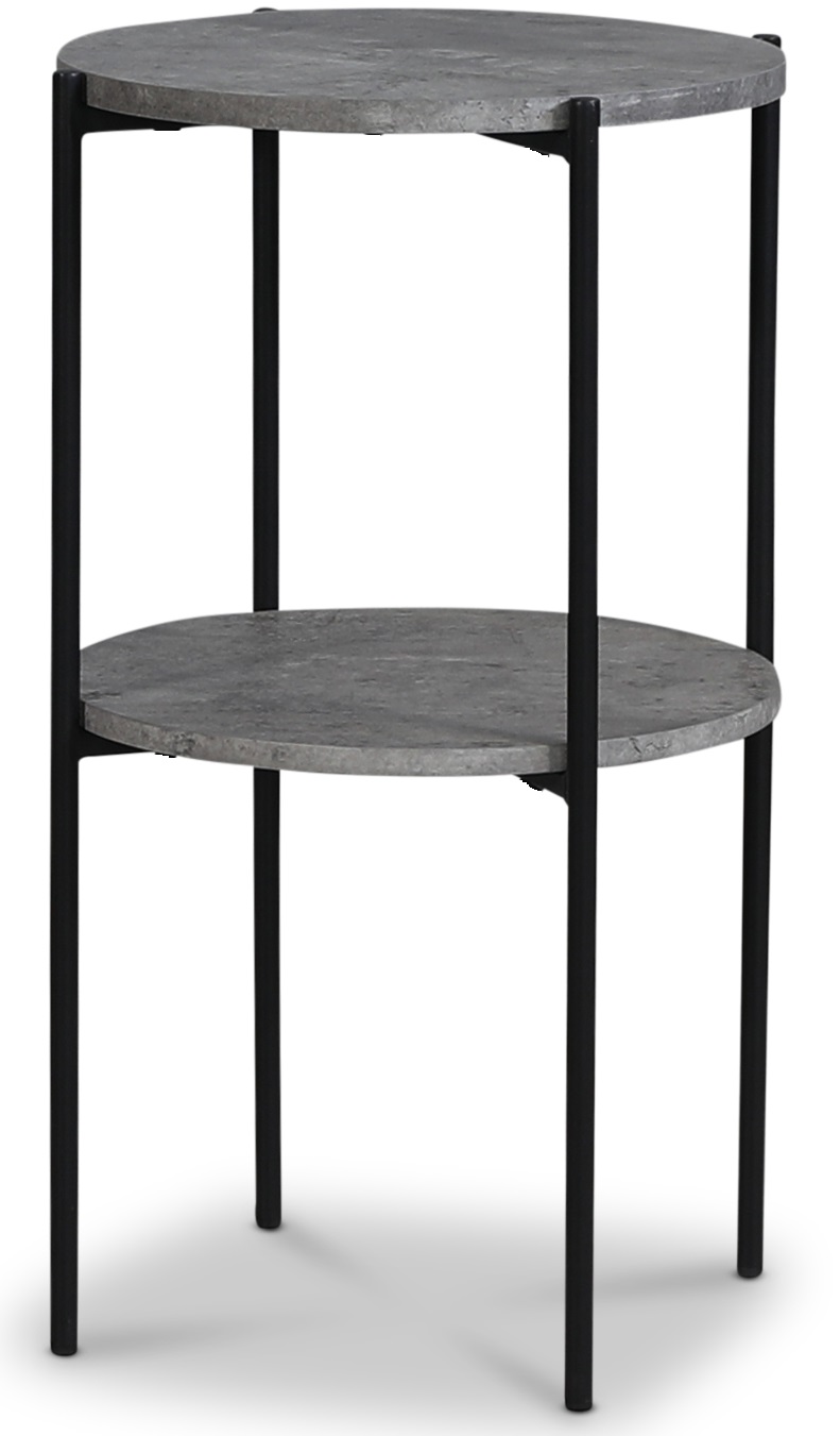 Shanghain yöpöytä MDF-levyä, sementtijäljitelmä ja mustat metallijalat. Alla hylly, joka sopii mainiosti pienten tavaroiden laittamiseen.