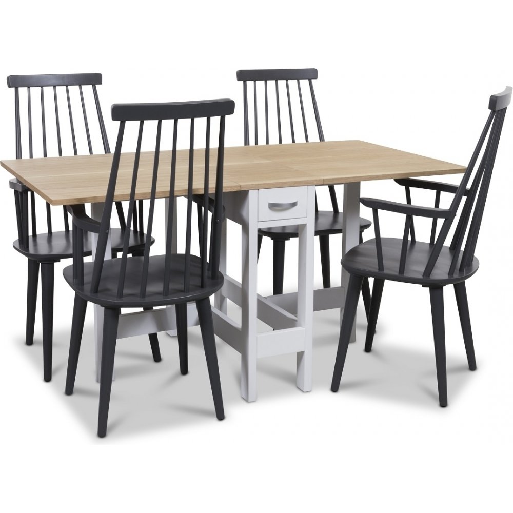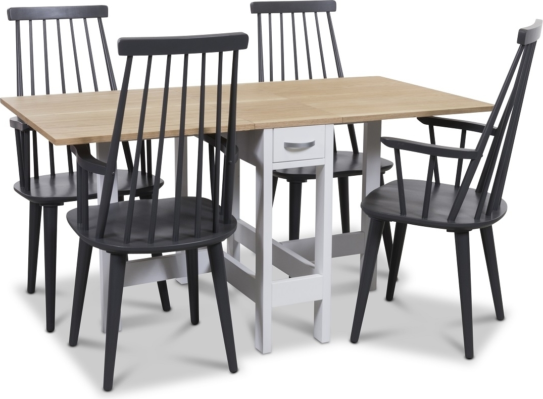 Signum ruokailuryhmä Kuonapöytä valkoinen/tammi 4 harmaalla Dalsland-ruokotuolilla käsinojilla