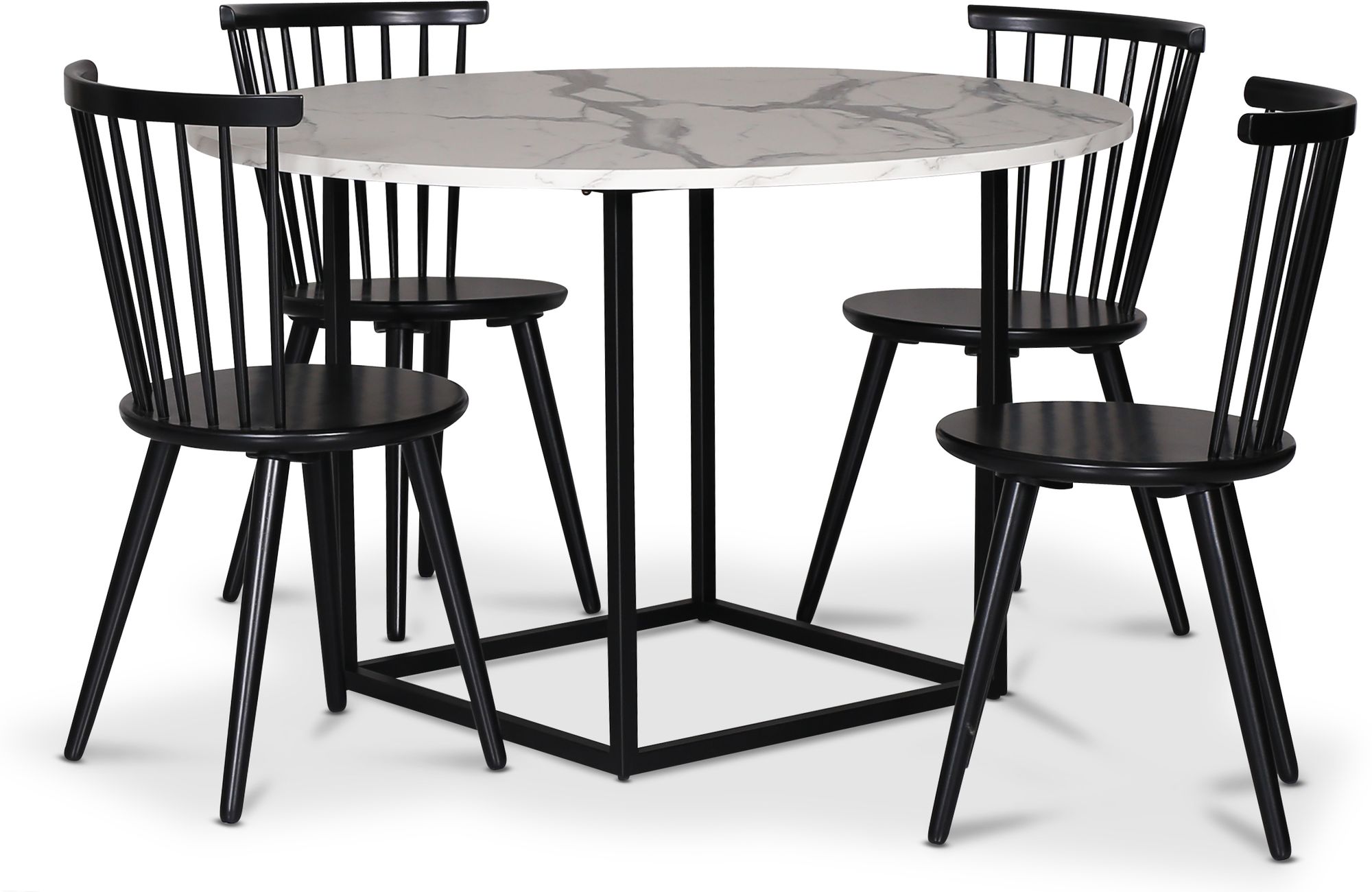- Sintorp ruokailuryhmä, pyöreä ruokapöytä Ø115 cm sis. 4 mustaa uloketuolia Castor - Valkoinen marmori (laminaatti)