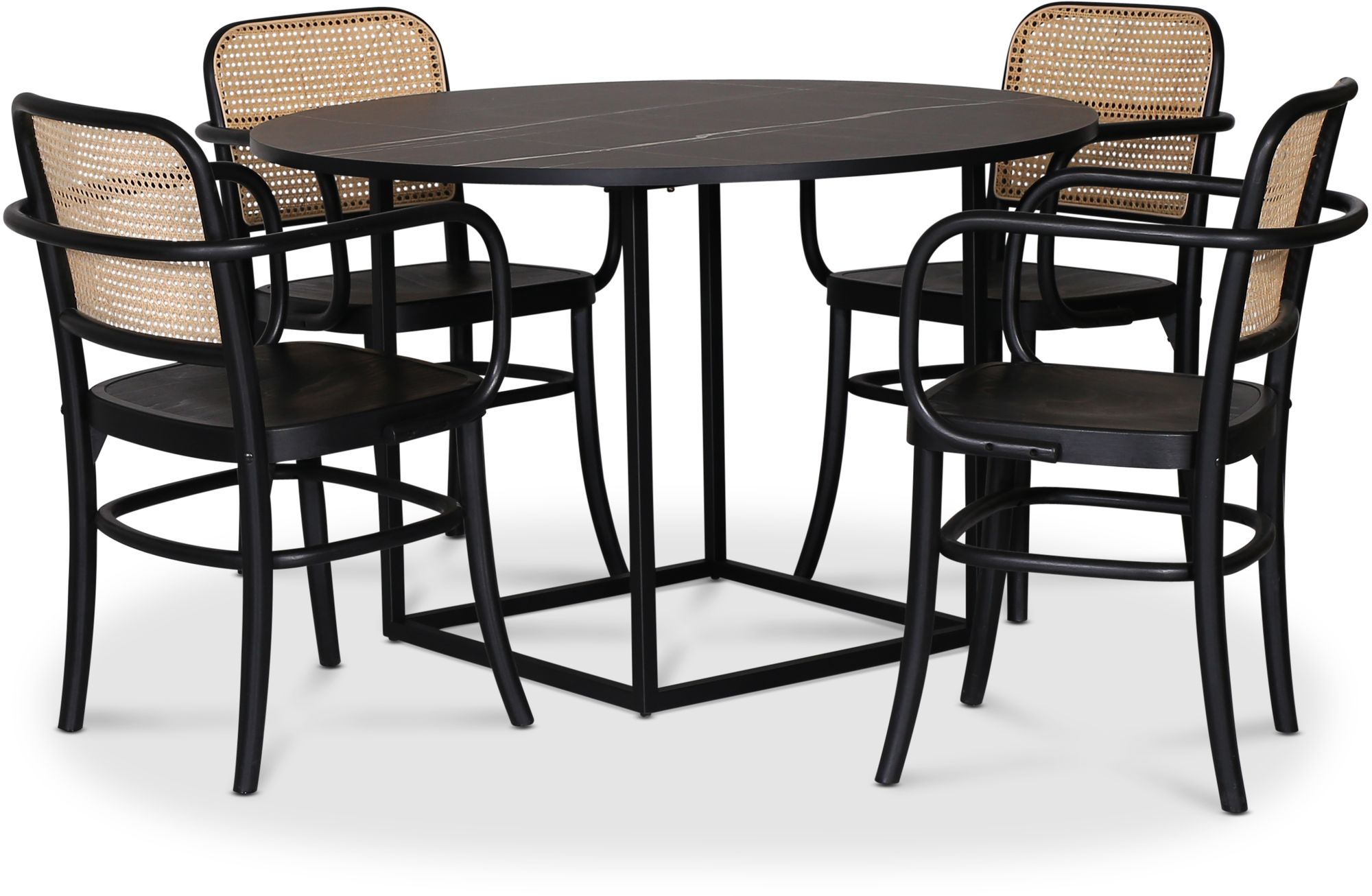 - Sintorp ruokailuryhmä, pyöreä ruokapöytä Ø115 cm sis. 4 Nemis runkotuolia taivutettua puuta - Musta marmori (laminaatti)