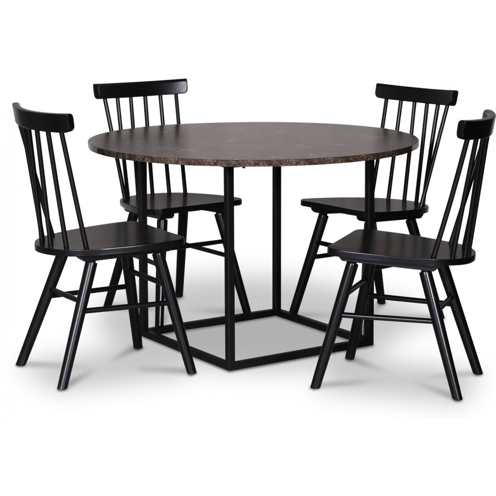 - Sintorp ruokailuryhmä, pyöreä ruokapöytä Ø115 cm sis. 4 Orust mustaa uloketuolia - Ruskea marmori (laminaatti)
