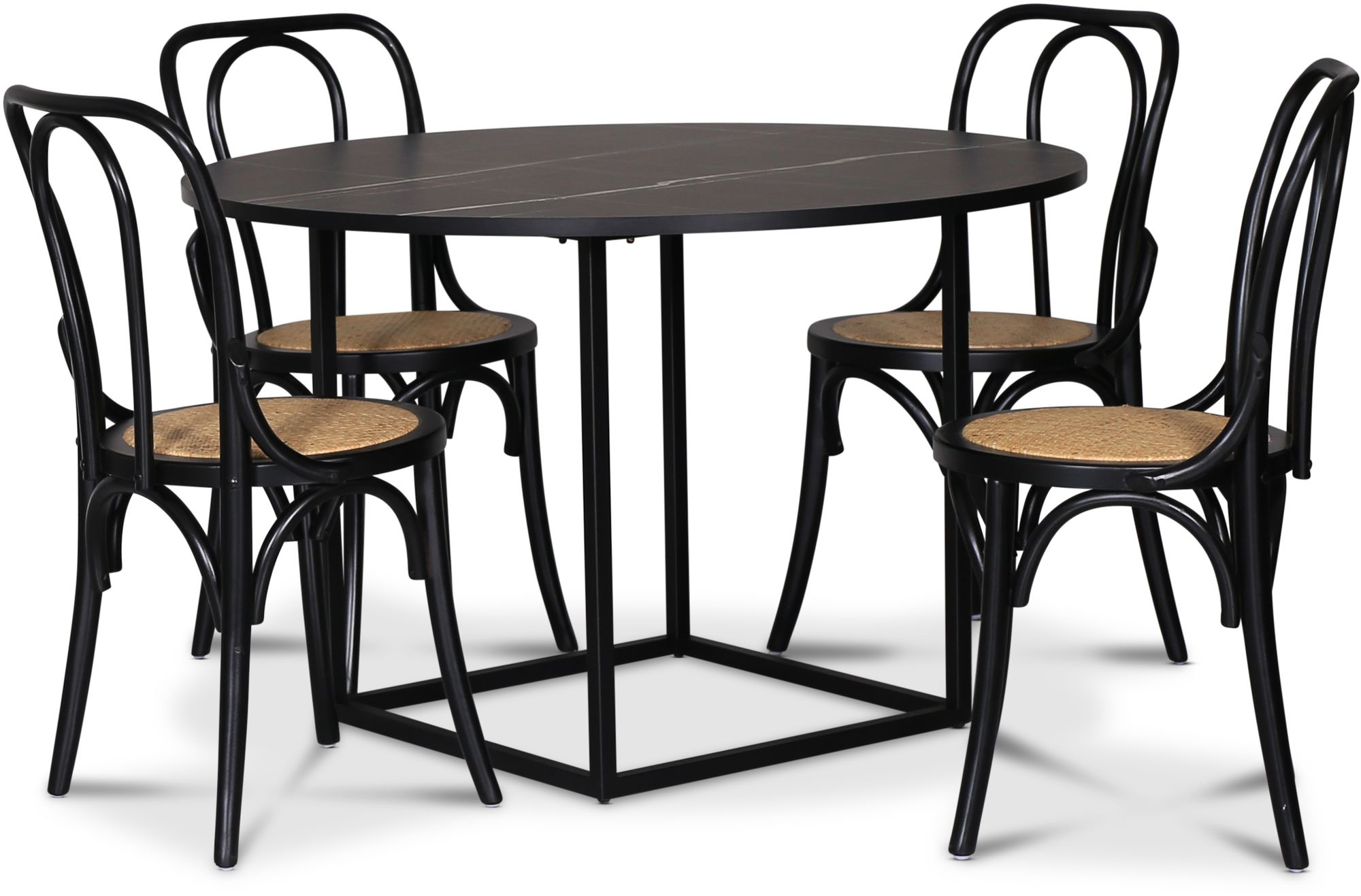 Sintorp ruokailuryhmä, pyöreä ruokapöytä Ø115 cm sis. 4 sarjaa taivutettuja tuoleja - Musta marmori (laminaatti):