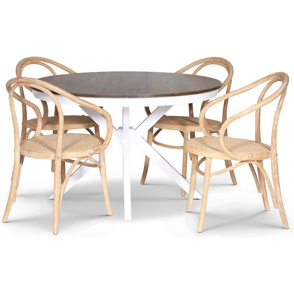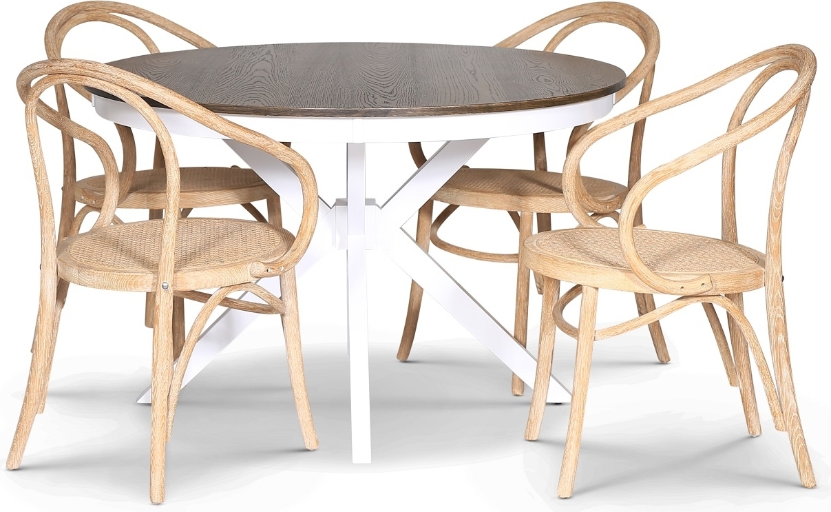 Skagen elintarvikeryhmä; pyöreä ruokapöytä 120 cm - Valkoiseksi/ruskeaksi petsattu tammi ja 4 Danderyd No.30 tuolia Whitewash