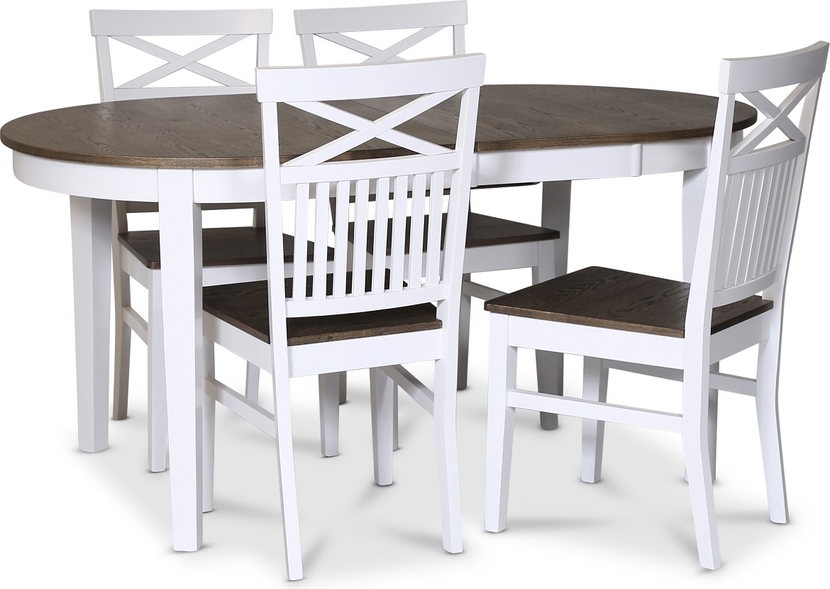 Skagen-ruokailuryhmä Skånska Möbelhusetilta, klassinen ruokapöytä 160/210x90 cm, valkoinen pohja ja kansi ruskeaa öljyttyä tammiviilua. Sisältää 4 yhteensopivaa Skagen-ruokailutuolia, joissa ristit selässä, valkoiseksi lakattua puuta ja ruskeat öljytyt ulostulot.
