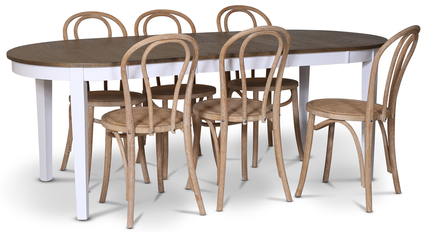 Skagen-ruokailuryhmä Skånska Möbelhusetilta, klassinen ruokapöytä 160/210x90 cm, valkoinen pohja ja kansi ruskeaa öljyttyä tammiviilua. Sisältää 6 yhteensopivaa Danderyd No.18 -ruokatuolia Borstat-valkitusta puusta ja rottinkiistuin.