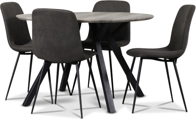 Ruokailuryhmä Skånska Möbelhusetiltä. Smokey-ruokapöytä, halkaisija 120 cm, pöytätasossa harmaapetsattu tammilaminaatti. Lisäksi 4kpl yhteensopivaa ruskeanharmaata vintage-verhoiltua Smokey-ruokatuolia mustilla jaloilla.