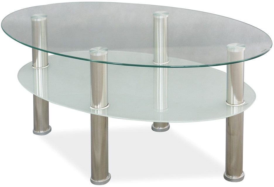 Upea ja moderni sohvapöytä. Runko on valmistettu kromatusta metallista ja pöytälevy on karkaistua lasia, varustettu myös käytännöllisellä hyllyllä.