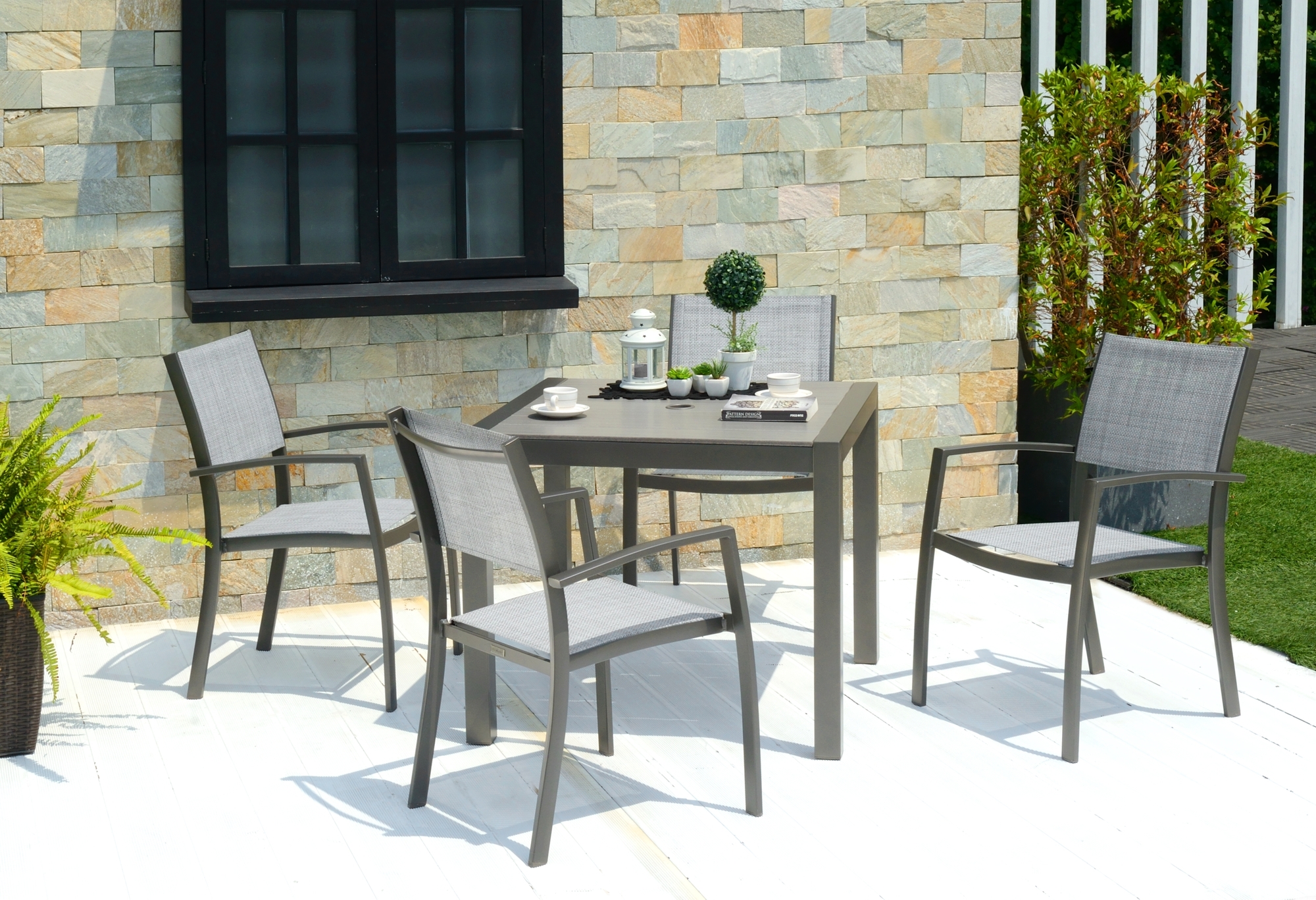 Ruokailuryhmä, jossa ruokapöytä (88x88 cm) ja 4 pinottavaa ruokatuolia.