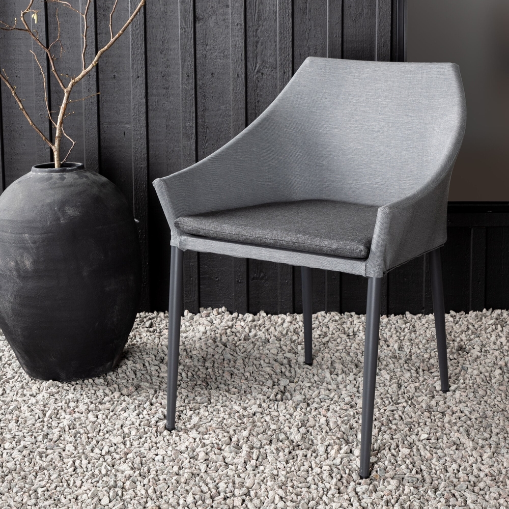 Tyylikäs ja mukava harmaa tuoli mustilla jaloilla, joka sopii kaikkiin illallisiin parvekkeella tai terassilla. Yhdistä suosikkipöytäsi kanssa ja olet valmis! Spoga on ajaton muotoilu neutraaleilla väreillä, jotka mahdollistavat tuolin pitkän käytön.
