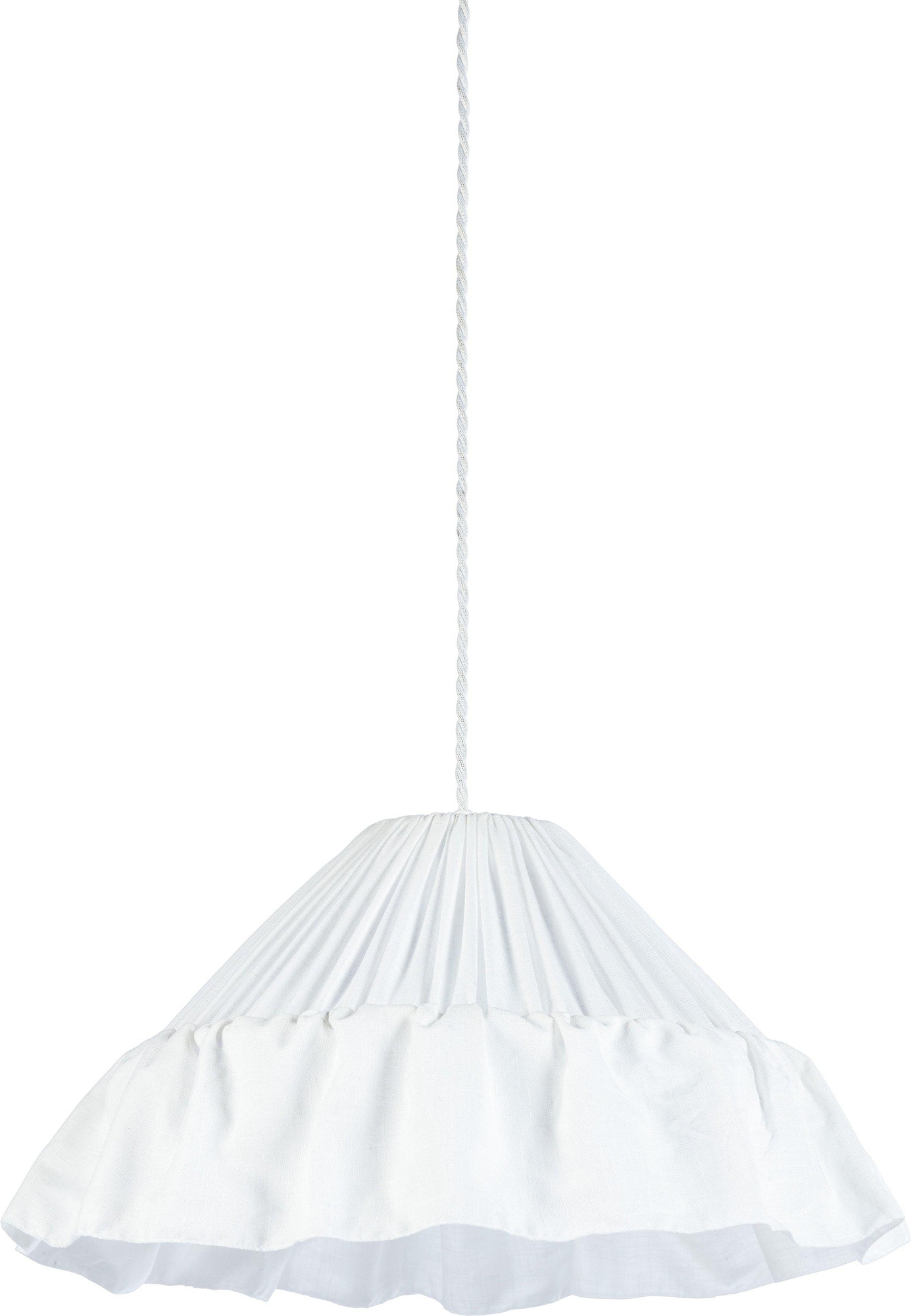 Kattovalaisin Stina puuvillakangasta, jossa on pellavamainen rakenne. Muoto on hieman kartiomainen ja rypytetty hame. Valkoinen kattoripustus koukkuripustukseen kierretyllä tekstiilinauhalla. Kattopistorasia ja valonlähde eivät sisälly toimitukseen. Suosittelemme enintään 8W LED-valonlähdettä.