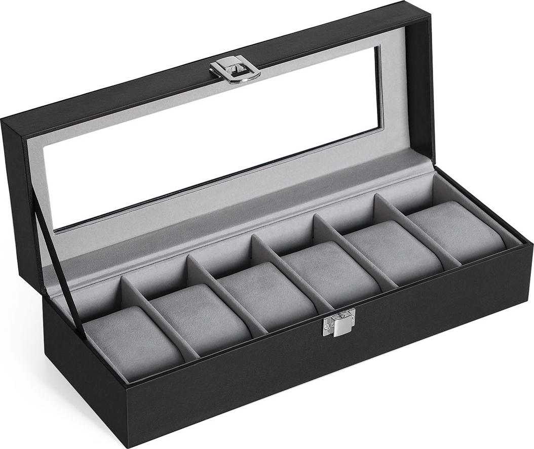 Puinen kellolaatikko, joka on päällystetty PU-nahalla ja vuorattu sametilla.