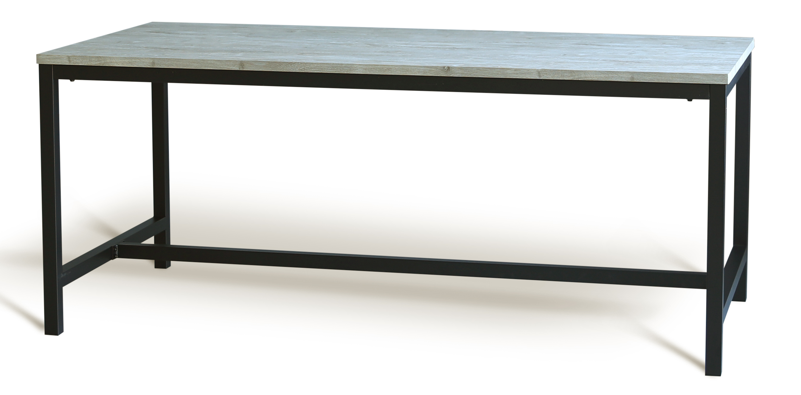 Laminoidusta MDF-levystä valmistettu ruokapöytä metallijaloilla.