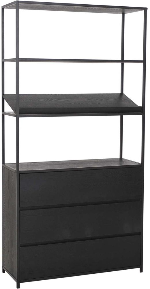 Kaunis hylly, jossa on moderni muotoilu. Runko on mustaksi pulverimaalattua metallia, laatikot ja hyllyt mustaa saarnia. Kolme hyllyä ja kolme laatikkoa älykkääseen säilytykseen sekä kirjahylly, joka voidaan sijoittaa haluamallesi hyllylle.