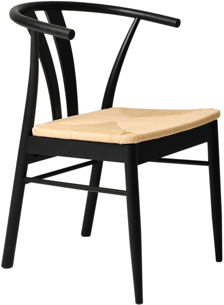 Tuoli, jolla on harmoninen ulkonäkö. Istuin on punottu beigenväriseen, mustaan puurunkoon.