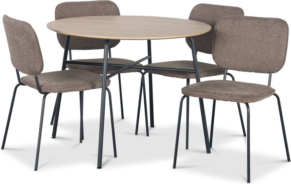Tufta-ruokailuryhmä koostuu Ø100 cm pöydästä, jonka kansi on MDF-levyä vaalealla puulla, pohja mustaa jauhemaalattua metallia. Mukana on myös 4 Lokrume-tuolia, joissa on ruskea verhoilu ja musta runko. Ruokailuryhmä tyylikkäällä modernilla designilla. Keskity olemaan minimalistinen suunnittelussa ja värien valinnassa, jotka sopivat hyvin yhteen.