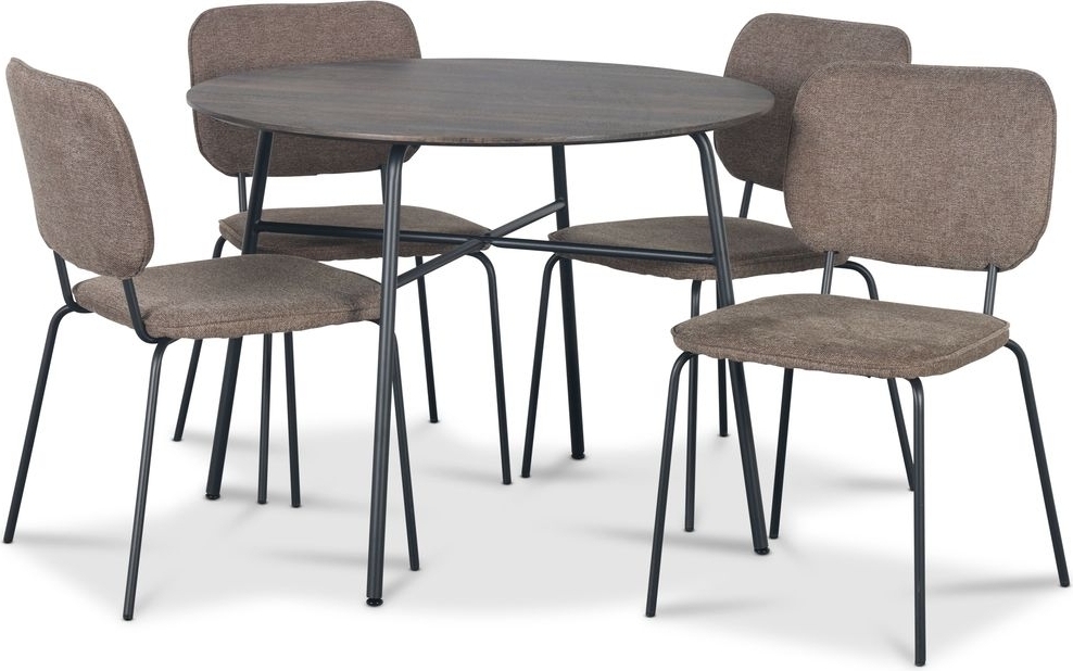 Tufta-ruokailuryhmä koostuu Ø100 cm pöydästä, jonka kansi on tummaa puuta MDF-levyä, pohja mustaa jauhemaalattua metallia. Mukana on myös 4 Lokrume-tuolia, joissa on ruskea verhoilu ja musta runko. Ruokailuryhmä tyylikkäällä modernilla designilla. Keskity olemaan minimalistinen suunnittelussa ja värien valinnassa, jotka sopivat hyvin yhteen.